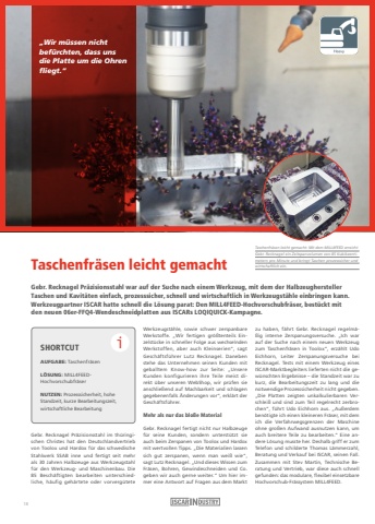 %u201eWir m%u00fcssen nicht bef%u00fcrchten, dass uns die Platte um die Ohren fliegt.%u201cTaschenfr%u00e4sen leicht gemachtGebr. Recknagel Pr%u00e4zisionsstahl war auf der Suche nach einem Werkzeug, mit dem der Halbzeughersteller Taschen und Kavit%u00e4ten einfach, prozesssicher, schnell und wirtschaftlich in Werkzeugst%u00e4hle einbringen kann. Werkzeugpartner ISCAR hatte schnell die L%u00f6sung parat: Den MILL4FEED-Hochvorschubfr%u00e4ser, best%u00fcckt mit den neuen 06er-FFQ4-Wendeschneidplatten aus ISCARs LOQIQUICK-Kampagne.SHORTCUTAUFGABE: Taschenfr%u00e4senL%u00d6SUNG: MILL4FEEDHochvorschubfr%u00e4serNUTZEN: Prozesssicherheit, hohe Standzeit, kurze Bearbeitungszeit, wirtschaftliche BearbeitungiTaschenfr%u00e4sen leicht gemacht: Mit dem MILL4FEED erreichtGebr. Recknagel ein Zeitspanvolumen von 85 Kubikzentimetern pro Minute und bringt Taschen prozesssicher und wirtschaftlich ein.Gebr. Recknagel Pr%u00e4zisionsstahl im th%u00fcringischen Christes hat den Deutschlandvertrieb von Toolox und Hardox f%u00fcr das schwedische Stahlwerk SSAB inne und fertigt seit mehr als 30 Jahren Halbzeuge aus Werkzeugstahl f%u00fcr den Werkzeug- und Maschinenbau. Die 85 Besch%u00e4ftigten bearbeiten unterschiedliche, h%u00e4ufig geh%u00e4rtete oder vorverg%u00fctete Werkzeugst%u00e4hle, sowie schwer zerspanbare Werkstoffe. %u201eWir fertigen gr%u00f6%u00dftenteils Einzelst%u00fccke in schneller Folge aus wechselndenWerkstoffen, aber auch Kleinserien%u201c, sagt Gesch%u00e4ftsf%u00fchrer Lutz Recknagel. Daneben stehe das Unternehmen seinen Kunden mit geballtem Know-how zur Seite: %u201eUnsere Kunden konfigurieren ihre Teile meist direkt %u00fcber unseren WebShop, wir pr%u00fcfen sie anschlie%u00dfend auf Machbarkeit und schlagen gegebenenfalls %u00c4nderungen vor%u201c, erkl%u00e4rt der Gesch%u00e4ftsf%u00fchrer.Mehr als nur das blo%u00dfe MaterialGebr. Recknagel fertigt nicht nur Halbzeuge f%u00fcr seine Kunden, sondern unterst%u00fctzt sie auch beim Zerspanen von Toolox und Hardox mit wertvollen Tipps. %u201eDie Materialien lassen sich gut zerspanen, wenn man wei%u00df wie%u201c, sagt Lutz Recknagel. %u201eUnd dieses Wissen zum Fr%u00e4sen, Bohren, Gewindeschneiden und Co.geben wir auch gerne weiter.%u201c Um hier immer eine Antwort auf Fragen aus dem Markt zu haben, f%u00e4hrt Gebr. Recknagel regelm%u00e4%u00dfig interne Zerspanungsversuche. %u201eIch war auf der Suche nach einem neuen Werkzeug zum Taschenfr%u00e4sen in Toolox%u201c, erz%u00e4hlt Udo Eichhorn, Leiter Zerspanungsversuche bei Recknagel. Tests mit einem Werkzeug eines ISCAR-Marktbegleiters lieferten nicht die gew%u00fcnschten Ergebnisse %u2013 die Standzeit war zu kurz, die Bearbeitungszeit zu lang und die notwendige Prozesssicherheit nicht gegeben.%u201eDie Platten zeigten unkalkulierbaren Verschlei%u00df und sind zum Teil regelrecht zerbrochen%u201c, f%u00fchrt Udo Eichhorn aus. %u201eAu%u00dferdem ben%u00f6tigte ich einen kleineren Fr%u00e4ser, mit dem ich die Verfahrwegsgrenzen der Maschine ohne gro%u00dfen Aufwand ausnutzen kann, um auch breitere Teile zu bearbeiten.%u201c Eine andere L%u00f6sung musste her. Deshalb griff er zum Telefon und schilderte Thomas L%u00e4mmerzahl, Beratung und Verkauf bei ISCAR, seinen Fall.Zusammen mit Stev Martin, Technische Beratung und Vertrieb, war diese auch schnell gefunden: das modulare, flexibel einsetzbare Hochvorschub-Fr%u00e4ssystem MILL4FEED.18