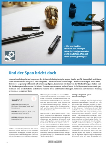 Und der Span bricht dochInternationale Regularien begrenzen die Bleianteile in Kupferlegierungen. Das ist gut f%u00fcr Gesundheit und Natur, stellt Hersteller und Zerspaner aber vor gro%u00dfe %u2013 oder vielleicht besser lange %u2013 Herausforderungen. Denn ohne Blei in der Legierung bilden sich oft ellenlange Sp%u00e4ne. Zusammen mit Experten der Wieland Gruppe haben sich die Werkzeugspezialisten von ISCAR des Themas angenommen. Im TechCenter in Ettlingen erarbeiteten sie gemeinsam eine breite Palette an Bohrern, Fr%u00e4sern, Dreh- und Stechwerkzeugen, mit denen sich bleifreies Messing problemlos zerspanen l%u00e4sst.%u201eWir wechselten deshalb auf weniger scharfe Stahlgeometrien mit Schutzfase. Das hat dann prima geklappt.%u201c1820 aus einer Glockengie%u00dferei in Ulm hervorgegangen, ist die Wieland Gruppe heute ein international agierender Anbieter von Kupferlegierungen, Halbfabrikaten aus Kupfer sowie von Komponenten- und Systeml%u00f6sungen.Mit einem globalen Netz von mehr als 80 Produktionsst%u00e4tten, Service- und Handelsh%u00e4usern sowie rund 10.000 Mitarbeitenden bietet das Unternehmen ein breites Produkt-, Technologie- und Serviceportfolio. Vom Prototyp bis zur Serienfertigung entwickelt Wieland L%u00f6sungen unter anderem f%u00fcr die Automotive-, Luft- und Raumfahrt-, Elektronik-, K%u00e4lte- und Klimatechnik-Branche.REACH Annex 17, RoHS, DWD und ELV %u2013 zahlreiche internationale Regularien begrenzen den Bleigehalt in Kupferlegierungen. Bislang eingesetzte und bew%u00e4hrte Werkstoffe sind damit auf lange Sicht nur noch bedingt nutzbar. Deshalb hat Wieland mit der ecoline-Serie eine Familie an bleifreien Produkten entwickelt, die diese ersetzen sollen. Doch deren Zerspanung stellt neue Anforderungen, denn Blei verleiht in den bleihaltigen Messing-Legierungen spezifische Eigenschaften, verbessert zum Beispiel ihre Zerspanbarkeit und die Werkzeugstandzeit.Geringer Bleigehalt %u2013 gro%u00dfe Herausforderungen Industriell wichtige Zerspanungsmessinge enthalten beispielsweise zwischen 0,5 und 3,5 Prozent Blei in kleinen Partikeln als Spanbrecher. Das Element liegt im Materialgef%u00fcge in fein dispersen Partikeln vor. Je mehr Blei enthalten ist, umso besser l%u00e4sst sich der Werkstoff bearbeiten. Blei sorgt f%u00fcr eine gewisse Schmierung beim Zerspanen und f%u00fcr kurze Sp%u00e4ne. %u201eDie Herausforderung besteht darin, diese Charakteristika auch bei Bleifreiheit sicherzustellen%u201c, erkl%u00e4rt Angelos Tanios, Prozessingenieur bei Wieland. Um diese Eigenschaften im bleifreien Messing verf%u00fcgbar zu machen, setzt Wieland bei seinen ecoline-Legierungen, wie zum Beispiel eco SZ3, Silizium und Phosphor ein. Die sich bildenden Phosphide sind in der Legierung %u00e4hnlich wie Bleipartikel verteilt und dienen als Sollbruchstellen f%u00fcr die Sp%u00e4ne. Damit erreichen die neuen Werkstoffe eine sehr gute Zerspanbarkeit.SHORTCUTAUFGABE: Zerspanen von bleifreiem Messing auf Lang- und Kurzdrehern L%u00d6SUNG: Bohrer, Fr%u00e4ser, Dreh- und Stechwerkzeuge von ISCAR NUTZEN: Sehr guter Spanbruch, Prozesssicherheit i54