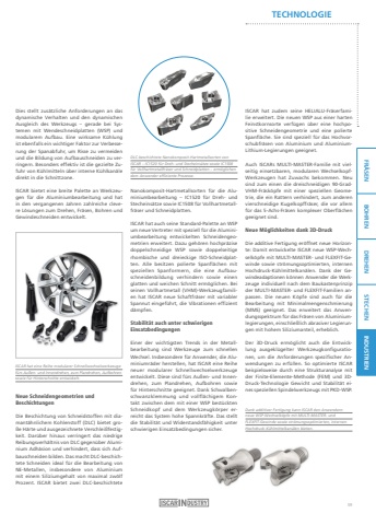 FR%u00c4SEN BOHREN DREHEN STECHEN INDUSTRIENTECHNOLOGIEDies stellt zus%u00e4tzliche Anforderungen an das dynamische Verhalten und den dynamischen Ausgleich des Werkzeugs %u2013 gerade bei Systemen mit Wendeschneidplatten (WSP) und modularem Aufbau. Eine wirksame K%u00fchlung ist ebenfalls ein wichtiger Faktor zur Verbesserung der Spanabfuhr, um Risse zu vermeiden und die Bildung von Aufbauschneiden zu verringern. Besonders effektiv ist die gezielte Zufuhr von K%u00fchlmitteln %u00fcber interne K%u00fchlkan%u00e4le direkt in die Schnittzone.ISCAR bietet eine breite Palette an Werkzeugen f%u00fcr die Aluminiumbearbeitung und hat in den vergangenen Jahren zahlreiche clevere L%u00f6sungen zum Drehen, Fr%u00e4sen, Bohren und Gewindeschneiden entwickelt.Neue Schneidengeometrien und Beschichtungen Die Beschichtung von Schneidstoffen mit diamant%u00e4hnlichem Kohlenstoff (DLC) bietet gro%u00dfe H%u00e4rte und ausgezeichnete Verschlei%u00dffestigkeit. Dar%u00fcber hinaus verringert das niedrige Reibungsverh%u00e4ltnis von DLC gegen%u00fcber Aluminium Adh%u00e4sion und verhindert, dass sich Aufbauschneiden bilden. Das macht DLC-beschichtete Schneiden ideal f%u00fcr die Bearbeitung von NE-Metallen, insbesondere von Aluminium mit einem Siliziumgehalt von maximal zw%u00f6lf Prozent. ISCAR bietet zwei DLC-beschichtete ISCAR hat zudem seine HELIALU-Fr%u00e4serfamilie erweitert. Die neuen WSP aus einer harten Feinstkornsorte verf%u00fcgen %u00fcber eine hochpositive Schneidengeometrie und eine polierte Spanfl%u00e4che. Sie sind speziell f%u00fcr das Hochvorschubfr%u00e4sen von Aluminium und AluminiumLithium-Legierungen geeignet.Auch ISCARs MULTI-MASTER-Familie mit vielseitig einsetzbaren, modularen WechselkopfWerkzeugen hat Zuwachs bekommen. Neu sind zum einen die dreischneidigen 90-GradVHM-Fr%u00e4sk%u00f6pfe mit einer speziellen Geometrie, die ein Rattern verhindert, zum anderen vierschneidige Kugelkopffr%u00e4ser, die vor allem f%u00fcr das 5-Achs-Fr%u00e4sen komplexer Oberfl%u00e4chen geeignet sind.Neue M%u00f6glichkeiten dank 3D-Druck Die additive Fertigung er%u00f6ffnet neue Horizonte: Damit entwickelte ISCAR neue WSP-Wechselk%u00f6pfe mit MULTI-MASTER- und FLEXFIT-Gewinde sowie str%u00f6mungsoptimierten, internen Hochdruck-K%u00fchlmittelkan%u00e4len. Dank der Gewindeadaptionen k%u00f6nnen Anwender die Werkzeuge individuell nach dem Baukastenprinzip der MULTI-MASTER- und FLEXFIT-Familien anpassen. Die neuen K%u00f6pfe sind auch f%u00fcr die Bearbeitung mit Minimalmengenschmierung (MMS) geeignet. Das erweitert das Anwendungsspektrum f%u00fcr das Fr%u00e4sen von Aluminiumlegierungen, einschlie%u00dflich abrasiver Legierungen mit hohem Siliziumanteil, erheblich.Der 3D-Druck erm%u00f6glicht auch die Entwicklung ausgekl%u00fcgelter Werkzeugkonfigurationen, um die Anforderungen spezifischer Anwendungen zu erf%u00fcllen. So optimierte ISCAR beispielsweise durch eine Strukturanalyse mit der Finite-Elemente-Methode (FEM) und 3DDruck-Technologie Gewicht und Stabilit%u00e4t eines speziellen Spindelwerkzeugs mit PKD-WSP.DLC-beschichtete Nanokomposit-Hartmetallsorten von ISCAR %u2013 IC1520 f%u00fcr Dreh- und Stecheins%u00e4tze sowie IC1508 f%u00fcr Vollhartmetallfr%u00e4ser und Schneidplatten %u2013 erm%u00f6glichen dem Anwender effiziente Prozesse.ISCAR hat eine Reihe modularer Schnellwechselwerkzeuge f%u00fcrs Au%u00dfen- und Innendrehen, zum Plandrehen, Aufbohrensowie f%u00fcr Hinterschnitte entwickelt.Dank additiver Fertigung kann ISCAR den Anwendern neue WSP-Wechselk%u00f6pfe mit MULTI-MASTER- und FLEXFIT-Gewinde sowie str%u00f6mungsoptimierten, internen Hochdruck-K%u00fchlmittelkan%u00e4len bieten.Nanokomposit-Hartmetallsorten f%u00fcr die Aluminiumbearbeitung %u2013 IC1520 f%u00fcr Dreh- und Stecheins%u00e4tze sowie IC1508 f%u00fcr Vollhartmetallfr%u00e4ser und Schneidplatten.ISCAR hat auch seine Standard-Palette an WSP um neue Vertreter mit speziell f%u00fcr die Aluminiumbearbeitung entwickelten Schneidengeometrien erweitert. Dazu geh%u00f6ren hochpr%u00e4zise doppelschneidige WSP sowie doppelseitige rhombische und dreieckige ISO-Schneidplatten. Alle besitzen polierte Spanfl%u00e4chen mit speziellen Spanformern, die eine Aufbauschneidenbildung verhindern sowie einen glatten und weichen Schnitt erm%u00f6glichen. Bei seinen Vollhartmetall (VHM)-Werkzeugfamilien hat ISCAR neue Schaftfr%u00e4ser mit variabler Spannut eingef%u00fchrt, die Vibrationen effizient d%u00e4mpfen.Stabilit%u00e4t auch unter schwierigen EinsatzbedingungenEiner der wichtigsten Trends in der Metallbearbeitung sind Werkzeuge zum schnellen Wechsel. Insbesondere f%u00fcr Anwender, die Aluminiumr%u00e4der herstellen, hat ISCAR eine Reihe neuer modularer Schnellwechselwerkzeuge entwickelt. Diese sind f%u00fcrs Au%u00dfen- und Innendrehen, zum Plandrehen, Aufbohren sowie f%u00fcr Hinterschnitte geeignet. Dank Schwalbenschwanzklemmung und vollfl%u00e4chigem Kontakt zwischen dem mit einer WSP best%u00fcckten Schneidkopf und dem Werkzeugk%u00f6rper erreicht das System hohe Spannkr%u00e4fte. Das stellt die Stabilit%u00e4t und Widerstandsf%u00e4higkeit unter schwierigen Einsatzbedingungen sicher.59