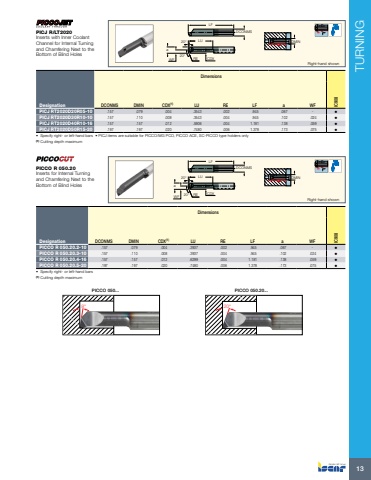 TURNING13aWF RE 20%u00b020%u00b0 LUCDXLFDCONMSDMINRight-hand shownDimensionsDesignation DCONMS DMIN CDX(1) LU RE LF a WF IC908PICJ RT2020D20R05-10 .157 .079 .004 .3543 .002 .945 .067 - %u2022 PICJ RT2020D30R10-10 .157 .110 .008 .3543 .004 .945 .102 .024 %u2022 PICJ RT2020D40R10-16 .157 .157 .012 .5906 .004 1.181 .138 .059 %u2022 PICJ RT2020D50R15-20 .197 .197 .020 .7480 .006 1.378 .173 .075 %u2022 %u2022 Specify right- or left-hand bars %u2022 PICJ items are suitable for PICCO/MG PCO, PICCO ACE, SC-PICCO type holders only(1) Cutting depth maximum PICJ R/LT2020Inserts with Inner Coolant Channel for Internal Turning and Chamfering Next to the Bottom of Blind HolesaWF 20%u00b0 RE20%u00b0 LUCDXLFDCONMSDMINRight-hand shownDimensionsDesignation DCONMS DMIN CDX(1) LU RE LF a WF IC908PICCO R 050.20.2-10 .157 .079 .004 .3937 .002 .945 .067 - %u2022 PICCO R 050.20.3-10 .157 .110 .008 .3937 .004 .945 .102 .024 %u2022 PICCO R 050.20.4-16 .157 .157 .012 .6299 .004 1.181 .138 .059 %u2022 PICCO R 050.20.5-20 .197 .197 .020 .7480 .006 1.378 .173 .075 %u2022 %u2022 Specify right- or left-hand bars(1) Cutting depth maximum PICCO 050... PICCO 050.20...8%u00b0 20%u00b0PICCO R 050.20Inserts for Internal Turning and Chamfering Next to the Bottom of Blind Holes