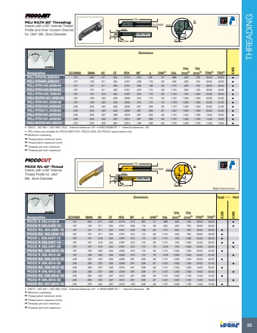 THREADING35CFWF aOHNPDXDCONMSOALxPDX60%u00b0HCXDimensionsDesignation DCONMS DMIN HC CF PDX WF a OHN(1) OALTPN (mm)(2)TPX (mm)(3) TPIN(4) TPIX(5) IC908PICJ RTH7I0.50D024 .157 .094 .011 .002 .0118 .012 .091 .31 .866 .500 .700 36.00 48.00 %u2022 PICJ RTH9I0.50D032 .157 .126 .011 .004 .0157 .039 .118 .39 .945 .500 .750 36.00 48.00 %u2022 PICJ RTH14I0.50D040 .157 .157 .011 .002 .0157 .059 .138 .59 1.181 .500 .750 36.00 48.00 %u2022 PICJ RTH14I0.50D050 .197 .197 .011 .002 .0157 .075 .173 .59 1.181 .500 .750 36.00 48.00 %u2022 PICJ RTH14I0.75D050 .197 .197 .016 .004 .0197 .075 .173 .59 1.181 .750 1.000 24.00 36.00 %u2022 PICJ R/LTH14I1.00D048 .197 .189 .022 .005 .0236 .075 .173 .59 1.181 1.000 1.250 20.00 24.00 %u2022 PICJ RTH19I1.00D048 .197 .189 .022 .005 .0236 .075 .173 .79 1.378 1.000 1.250 20.00 24.00 %u2022 PICJ RTH14I1.00D060 .236 .236 .022 .005 .0236 .091 .209 .59 1.181 1.000 1.250 20.00 24.00 %u2022 PICJ RTH21I1.00D060 .236 .236 .022 .005 .0236 .091 .209 .87 1.457 1.000 1.250 20.00 24.00 %u2022 PICJ RTH14I1.25D060 .236 .236 .027 .006 .0276 .091 .209 .59 1.181 1.250 1.500 16.00 20.00 %u2022 PICJ RTH14I1.50D060 .236 .236 .032 .007 .0315 .091 .209 .59 1.181 1.500 1.750 14.00 16.00 %u2022 PICJ R/LTH14I1.5D070 .276 .276 .032 .007 .0315 .106 .248 .59 1.181 1.500 1.750 14.00 16.00 %u2022 %u2022 DIN13 , ISO 68-1, ISO 965 (1&2) - Internal tolerance: 6H %u2022 ANSI/ASME B1.1 - Internal tolerance: 2B%u2022 PICJ items are suitable for PICCO/MG PCO, PICCO ACE, SC-PICCO type holders only(1) Minimum overhang (2) Thread pitch minimum (mm) (3) Thread pitch maximum (mm) (4) Threads per inch minimum (5) Threads per inch maximum PICJ R/LTH (60%u00b0 Threading)Inserts with a 60%u00b0 Internal Thread Profile and Inner Coolant Channel for .094\NUTSCREW60%u00b0CFWF aOHNPDXDCONMSOALxPDX60%u00b0HCXRight-hand shownDimensions Tough 1 HardDesignation DCONMS DMIN HC CF PDX WF a OHN(1) OALTPN (mm)(2)TPX (mm)(3) TPIN(4) TPIX(5) IC228 IC908PICCO R 003.0105-8 .157 .094 .011 .002 .0118 .012 .091 .31 .866 .500 .700 36.00 48.00 %u2022 PICCO R 004.0105-10 .157 .126 .011 .004 .0157 .039 .118 .39 .945 .500 .750 36.00 48.00 %u2022 PICCO R/L 004.0205-15 .157 .157 .011 .002 .0157 .059 .138 .59 1.181 .500 .750 36.00 48.00 %u2022 PICCO R/L 005.0205-15 .197 .197 .011 .002 .0157 .075 .173 .59 1.181 .500 .750 36.00 48.00 %u2022 PICCO L 005.0407-15 .197 .197 .016 .004 .0197 .075 .173 .59 1.181 .750 1.000 24.00 36.00 %u2022 PICCO R 005.0407-15 .197 .197 .016 .004 .0197 .075 .173 .59 1.181 .750 1.000 24.00 36.00 %u2022 %u2022 PICCO R 005.0407-20 .197 .197 .016 .004 .0197 .075 .173 .79 1.378 .750 1.000 24.00 36.00 %u2022 PICCO R/L 005.0510-15 .197 .189 .022 .005 .0236 .075 .173 .59 1.181 1.000 1.250 20.00 24.00 %u2022 PICCO R 005.0510-20 .197 .189 .022 .005 .0236 .075 .173 .79 1.378 1.000 1.250 20.00 24.00 %u2022 PICCO R/L 006.0510-15 .236 .236 .022 .005 .0236 .091 .209 .59 1.181 1.000 1.250 20.00 24.00 %u2022 PICCO R 006.0510-22 .236 .236 .022 .005 .0236 .091 .209 .87 1.457 1.000 1.250 20.00 24.00 %u2022 PICCO R/L 006.0612-15 .236 .236 .027 .006 .0276 .091 .209 .59 1.181 1.250 1.500 16.00 20.00 %u2022 PICCO R 006.0612-22 .236 .236 .027 .006 .0276 .091 .209 .87 1.457 1.250 1.500 16.00 20.00 %u2022 PICCO R/L 006.0815-15 .236 .236 .032 .007 .0315 .091 .209 .59 1.181 1.500 1.750 14.00 16.00 %u2022 PICCO R 006.0815-22 .236 .236 .032 .007 .0315 .091 .209 .87 1.457 1.500 1.750 14.00 16.00 %u2022 PICCO R/L 007.0815-15 .276 .276 .032 .007 .0315 .106 .248 .59 1.181 1.500 1.750 14.00 16.00 %u2022 %u2022 DIN13 , ISO 68-1, ISO 965 (1&2) - Internal tolerance: 6H %u2022 ANSI/ASME B1.1 - Internal tolerance: 2B(1) Minimum overhang (2) Thread pitch minimum (mm) (3) Thread pitch maximum (mm) (4) Threads per inch minimum (5) Threads per inch maximum PICCO R/L-60%u00b0-ThreadInserts with a 60%u00b0 Internal Thread Profile for .094\Min. Bore DiameterNUTSCREW60%u00b0