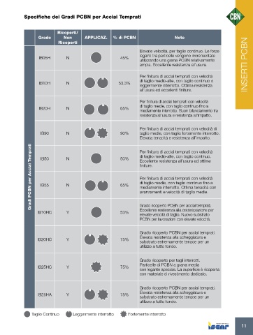 Grado   Ricoperti/  APPLICAZ. % di PCBN                            Note