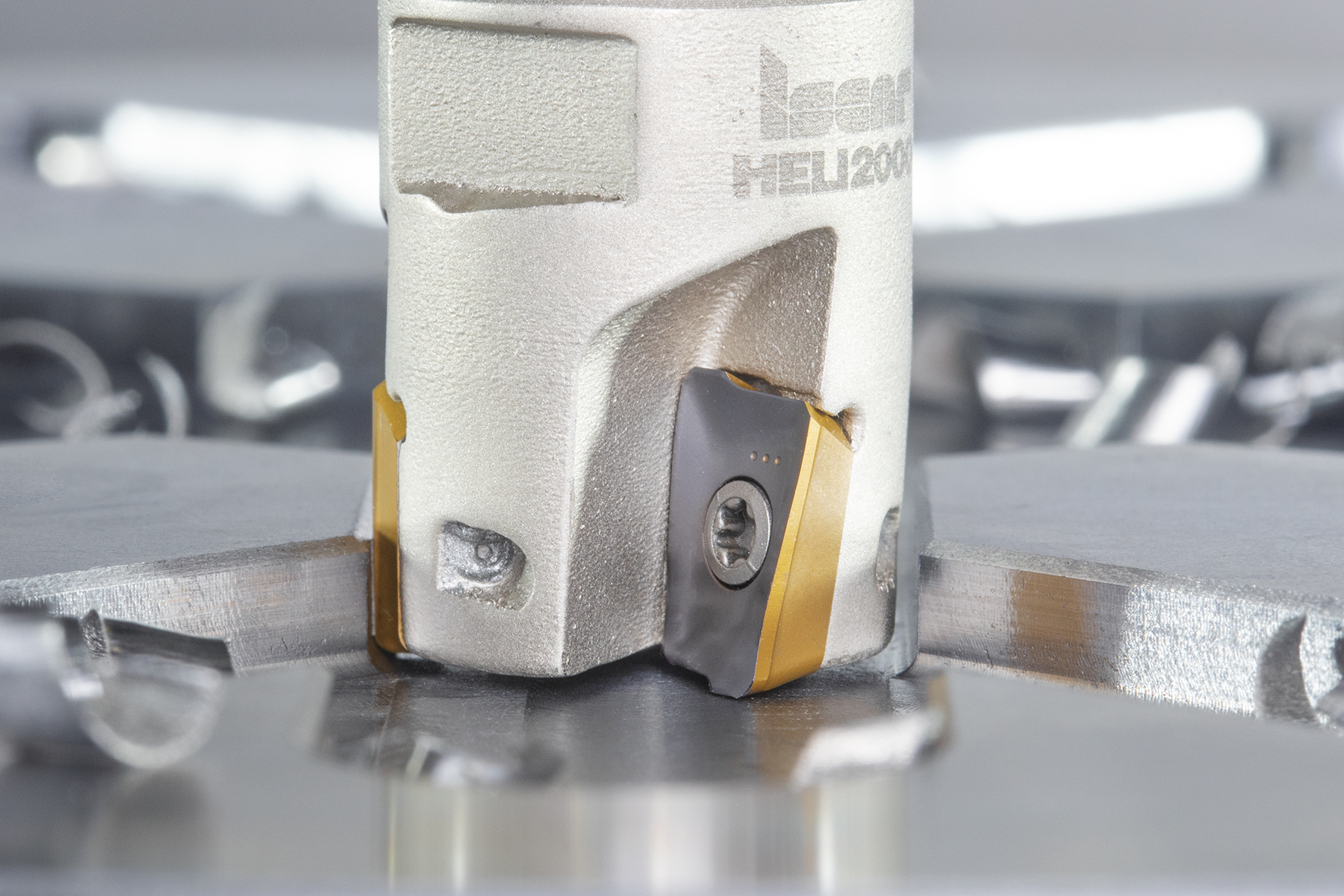 A proximate successor to the HELIMILL is the HELI-3-MILL, a family of milling tools introduced by ISCAR in the last decade, featuring triangular indexable inserts (Fig. 2). The advantages of the "helical triangle" highlight why this family has gained popularity in the market. However, it is important to note that this does not mean the triangle shape will completely replace the traditional parallelogram contour with helical cutting edges soon. The parallelogram shape still possesses its own competitive edge. Paradoxically, the narrow width of the parallelogram-shaped insert, which is considered a drawback when compared to the triangular shape, also offers certain advantages. Firstly, a narrower insert allows for an indexable design suitable for smaller tool diameters. Secondly, this insert geometry reduces the depth of the chip gullet, strengthening the cross-section of the tool body. This feature is particularly important for extended flute cutter designs where higher strength and rigidity of the body are crucial. The parallelogram insert structure also permits increased corner radii. Additionally, the classical shape is well-suited for high feed milling (HFM) inserts, which can be mounted in existing pockets, effectively transforming a 90-degree tool into an efficient HFM cutter. Moreover, the "helical parallelogram" has a smaller overall length compared to the "helical triangle" for the same cutting length. Therefore, it would be premature and incorrect to dismiss classical parallelogram inserts.